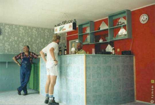 Buszmegálló-kocsma ( vagy mi ), a környék nagyvállakozójának "posztmodern" létesítménye. Asztalok nincsenek - csak padok- , de nem is illenének a tapétához.