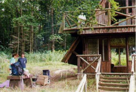 A "profi" turisták ebédet főznek, az alig szétvert faház mellett.