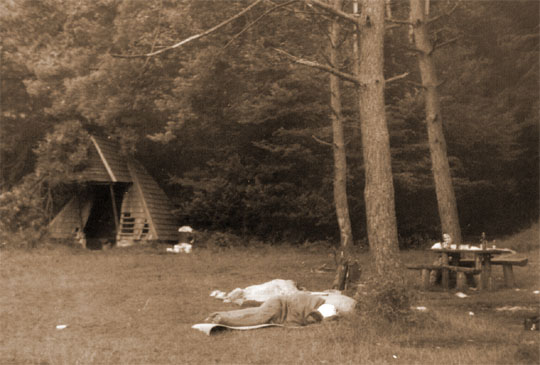 Még alszanak az esti evés-ivás-nótázásban megfáradt Turisták. (Megjegyzés: a faházról a cserepek nem az esti nótázás miatt estek le, már egyébként is hiányoztak.)