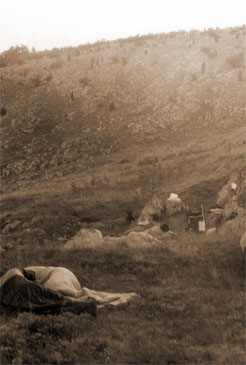 Reggeli csendélet a sziklakertben. Kedvesek itt az emberfiával, kivéve azzal aki a sárga jelet ott látja, ahová festették és nem a tó túloldalán. Az ilyen ne csodálkozzon, ha baltával köszöntenek rá. |