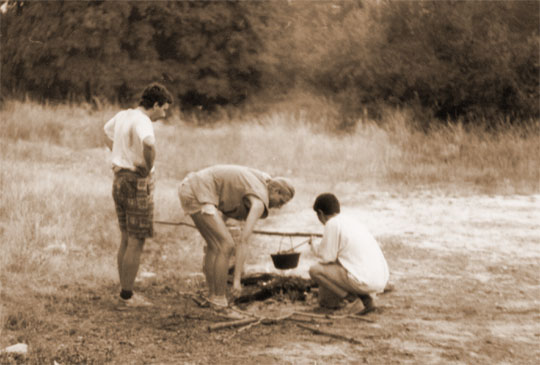 " Oly búsan dalonak a négerek..." A romokban heverő turistaház mellet készül a bableves - amiből még Csente is kap -, majd hajnalig tartó nótázás következik...