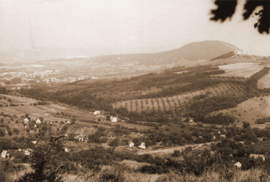 Előtérben a tokodi borospincék, távolban a Bundáshegy és a Nagy Gete.