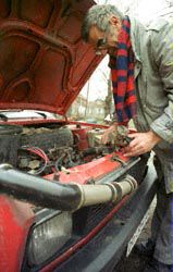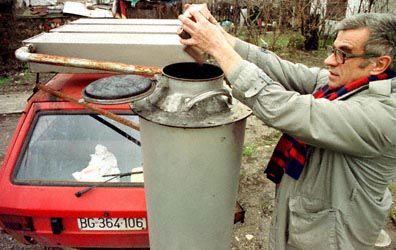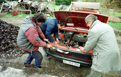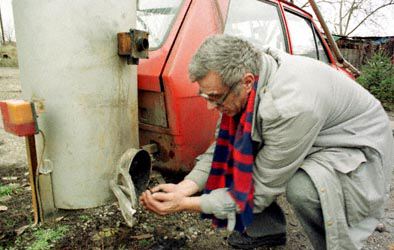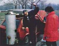 The process is based on incomplete combustion of wood: due to lack of air, gases are created: carbon monoxide, the main fuels, hydrogen and methane. That mixture of gases is as flammable as gasoline fumes. To get the car moving, it is necessary to "fill it up with wood". The whole mechanism is made of steel plate and it weighs 60 kg. The part in which the wood burns consists of two cylinders. The wood is put in the inner part which is connected to the pipe through which the gas comes to the filters. In the middle part of the cylinder is an opening through which the fire is lit with a torch. Vacuum must be established in the system and therefore the openings for putting in wood and taking out ash are closed with milk can lids (they found a new use here due to their adhesiveness). In the filters, gas is purified (dust and other impurities are removed) and cooled from 250-300oC to 25-30oC (it comes in the engine at that temperature, cool gas is easier to mix with air).